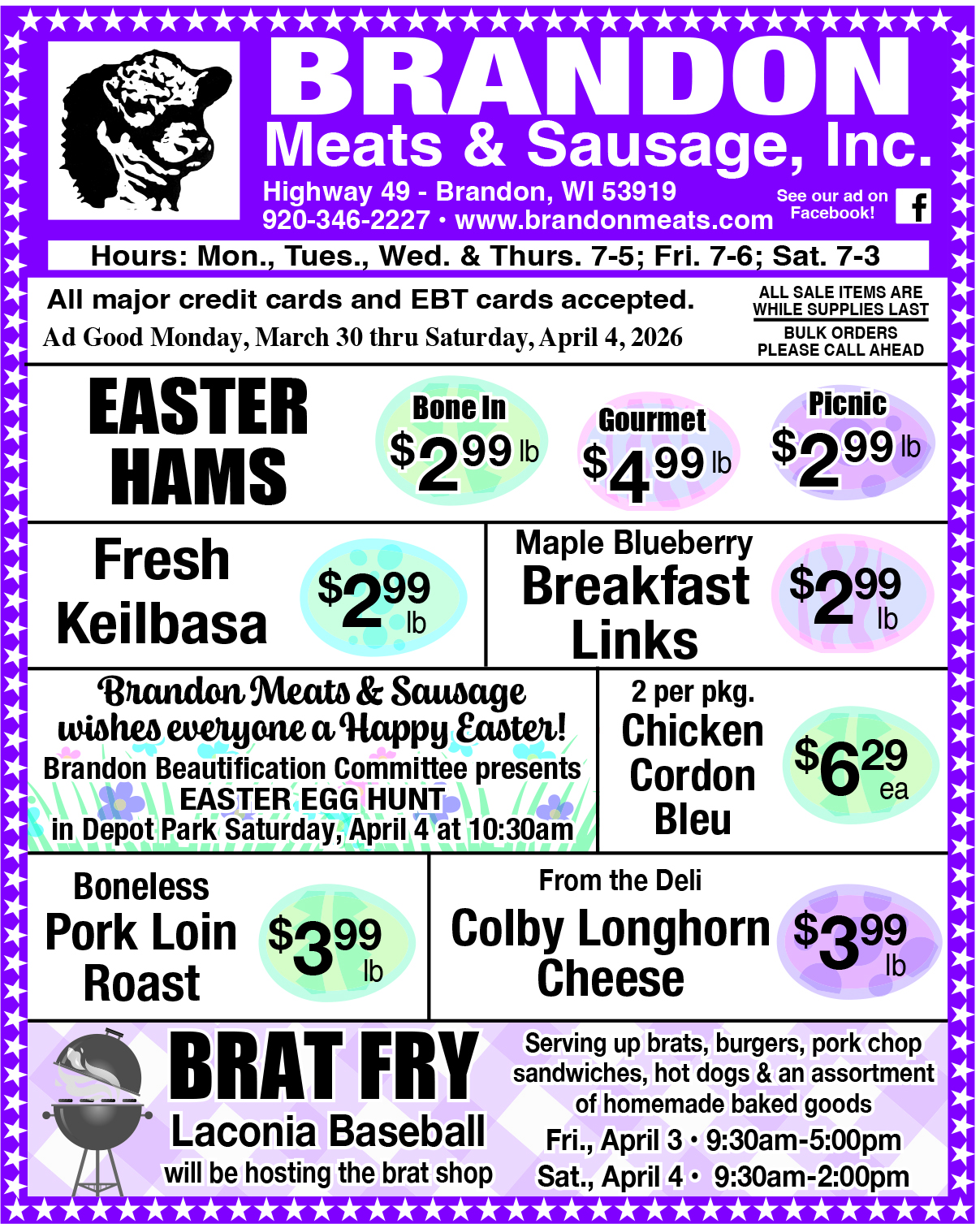 Page Summary: Brandon Meats & Sausage offers meat sales near me, steaks on sale near me, beef for sale near me and meat deals near me. Products and services such as best meat prices this week, meat package deals, best meat deals this week as well as meat specials this week are also part of the scope of our business. We also specialize in meat market specials, butcher specials in Ripon, Beaver Dam, Appleton as well as West Bend. Other areas we serve include Menasha, Waupun, Fond Du Lac and Oshkosh. We also service Watertown, Kaukauna and beyond.